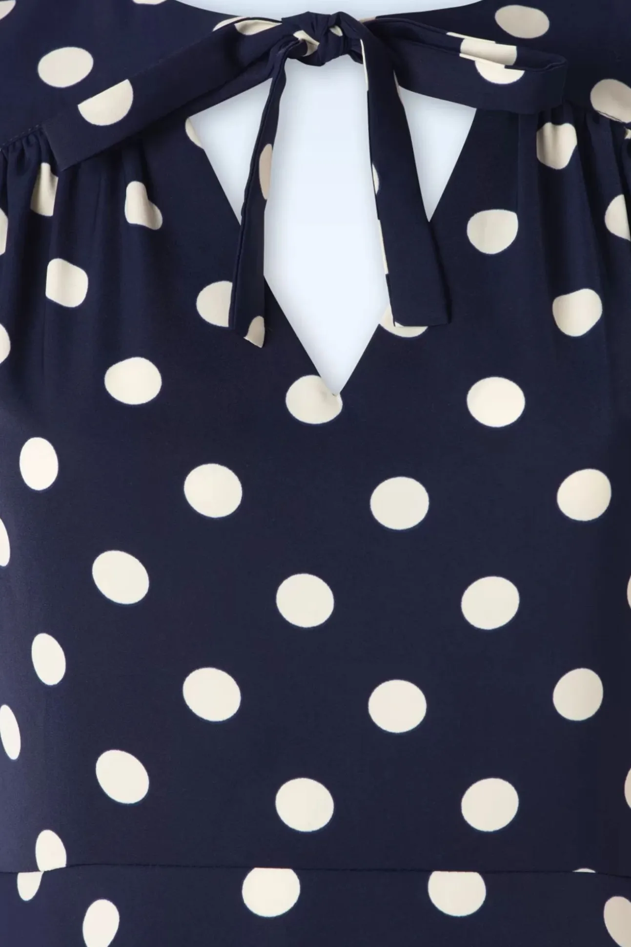 ”Feeling Flirty In Polkadots!” Deze Prachtige Swing Jurk Is Uitgevoerd In Een Marineblauwe, Soepele En Luchtige, Licht Glanzende Stof, Voorzien Van Crèmekleurige Polkadots.