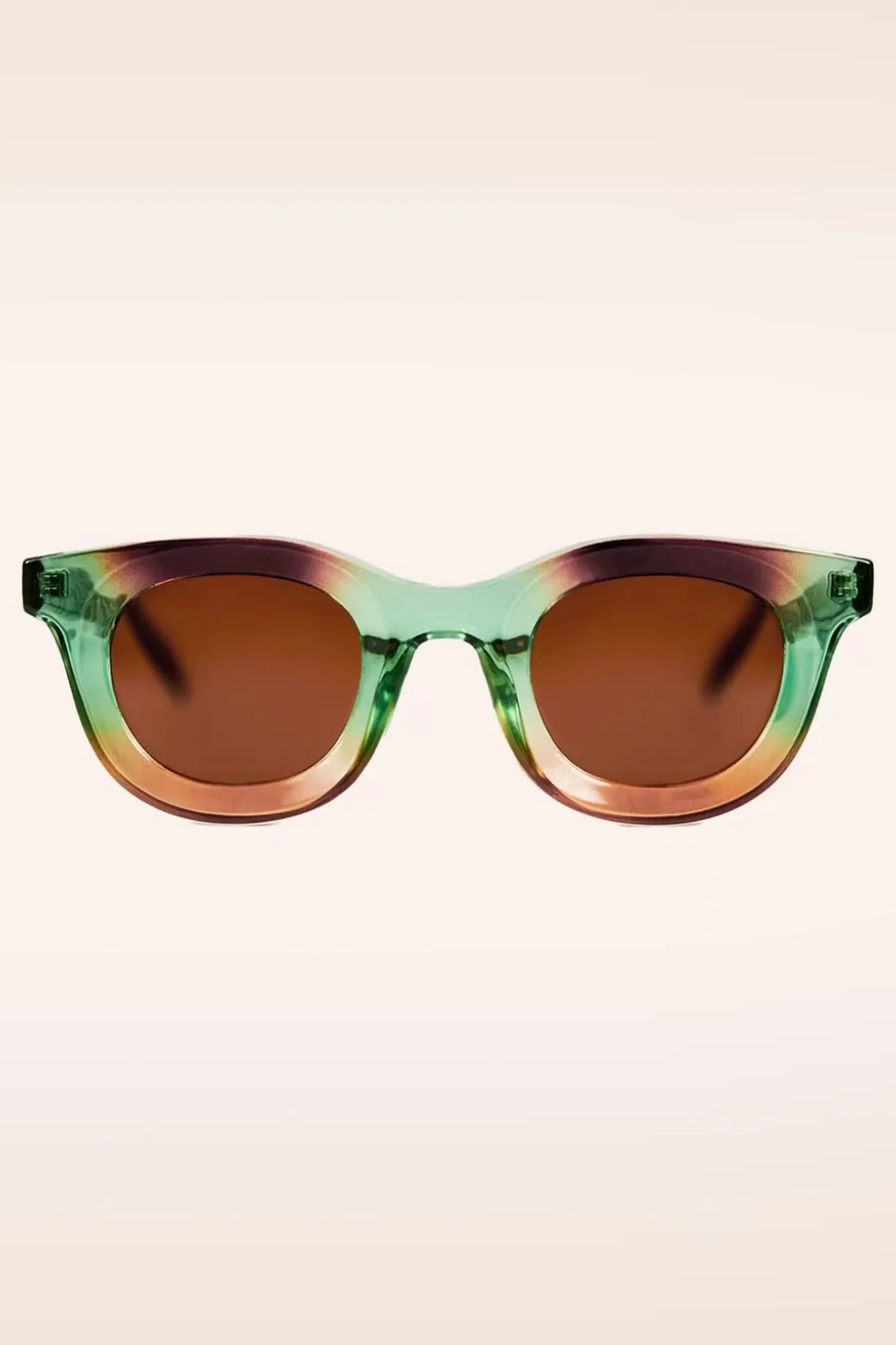 ”Let Your Sunglasses Do The Talking!” Een Stijlvol Model Gemaakt Van Gerecycled, Semi Transparant Kunststof In Groen En Bruin, Met Donkerbruine Pootjes Voorzien Van Een Streepjesprint En Bruine Poly Carbon Kunststof Glazen.