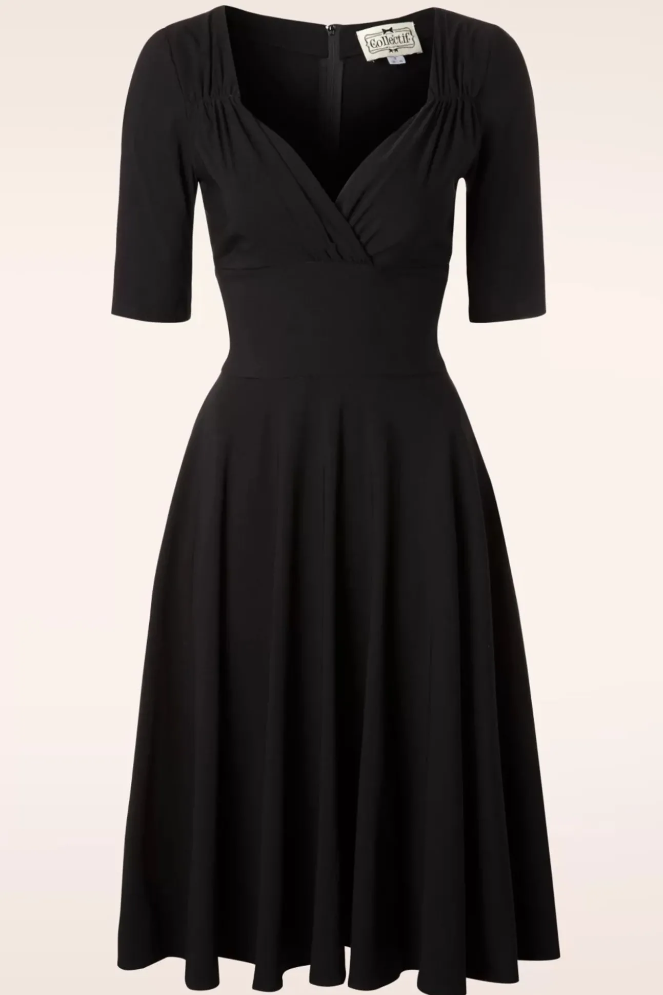 Romantisch, Sexy, Classy, Met Deze 50S Trixie Doll Swing Dress In Black Kun Je Alle Kanten Op 😉 De Prachtige Top Heeft Speelse Plooitjes Bij De Schouders En Een Geplooide Overslag Waardoor Ze Zowel Geschikt Is Voor Een Volle Als Een Bescheiden Cup, Oh La La! Vanaf De Taille Loopt Ze Prachtig Uit In Een Volle Cirkel Rok Die Extra Feestelijk Is In Combinatie Met Een Petticoat. Uitgevoerd In Een Zwarte Bengaline Met Een Heerlijke Stretch Voor Een Perfecte Pasvorm. Stijl Haar Up Or Down Al Naar Gelang De Gelegenheid, Ze Is Super Veelzijdig!