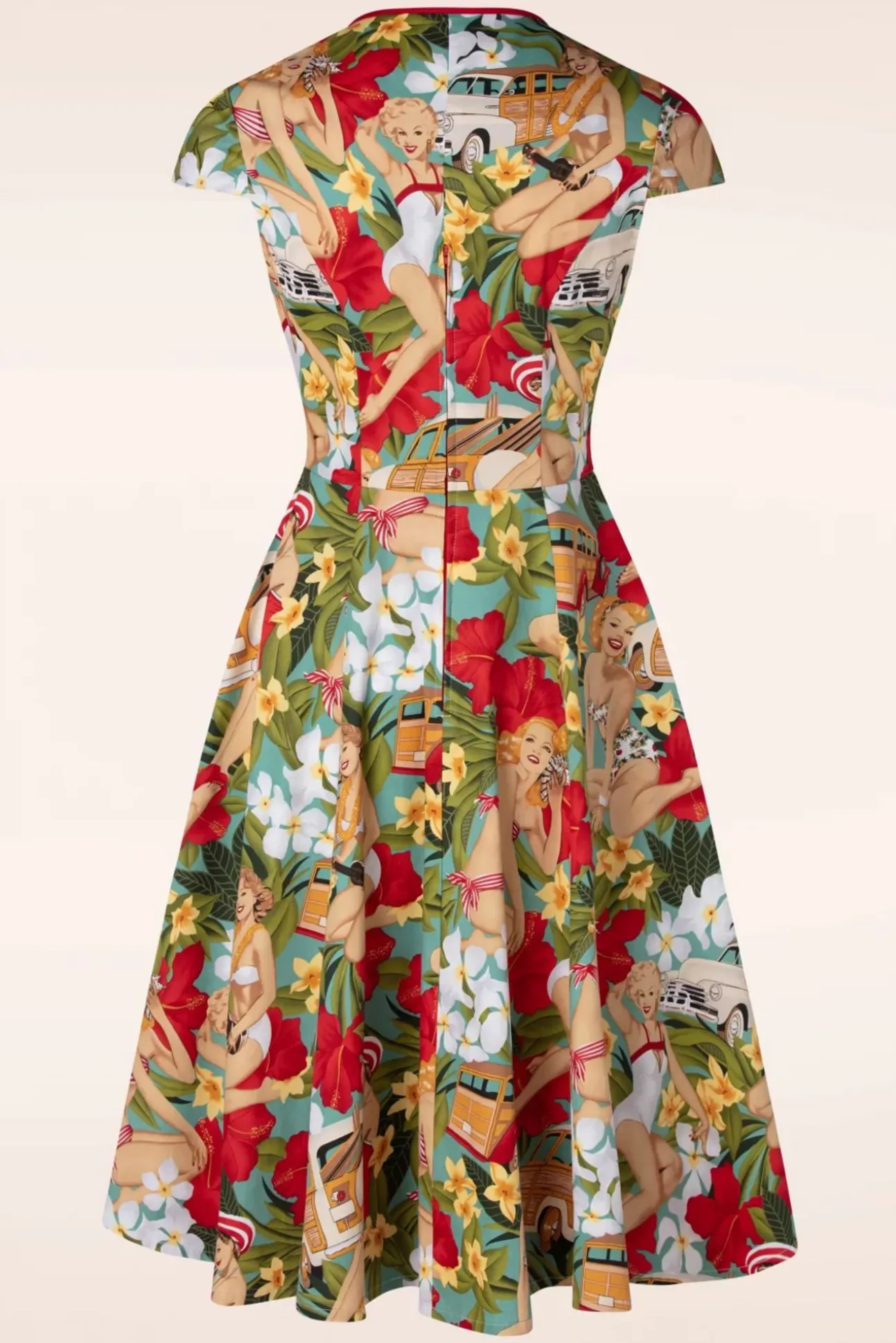 Met Deze Tropic Dreamer Dress In Blue Krijg Je Toch Zin In De Zomer?! De Aansluitende Top Heeft Een Elegante Keyhole Met Knoop, Druppelvormige Uitsneden En Schattige Kapmouwtjes. De Swing Rok Is Niet Alleen Super Flatterend, Maar Geeft Je Ook Een Super Vrouwelijk Silhouet. Uitgevoerd In Een Stevige Katoenmix Met Een Lichte Stretch Voor Een Heerlijk Draagcomfort. Met Haar Tropische Zomerprint Ben Je Helemaal Klaar Voor Het Warme Weer! 😉