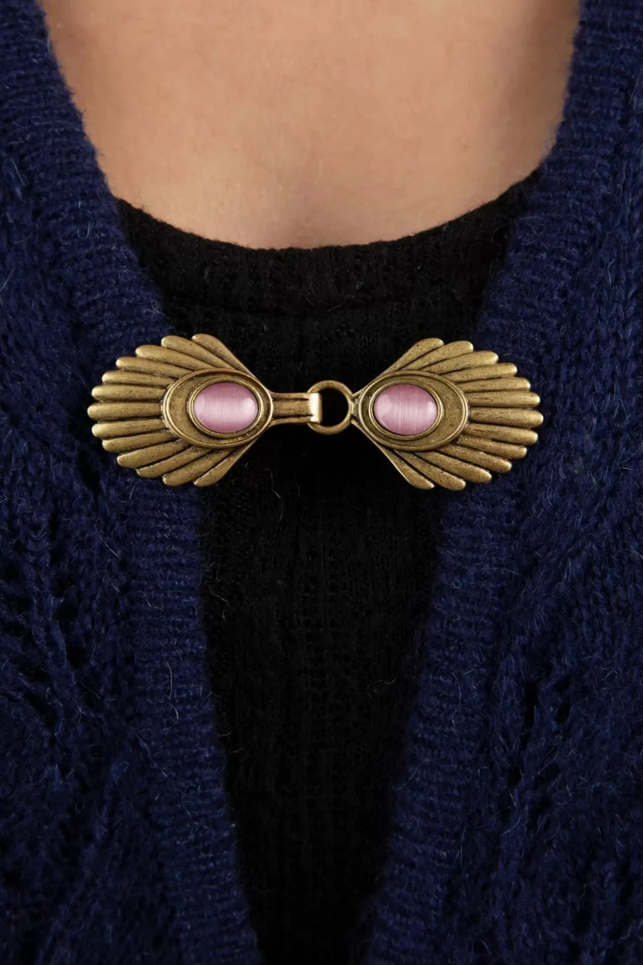 Al Die Leuke Vestjes, Jasjes En Kimono’s Zonder Sluiting Kun Je Nu Tóch Dicht Dragen Dankzij Deze Handige En Mooie Clips In Art-Deco Stijl. Ook Op Een Poncho, Sjaal Of Blouse Staan Ze Fantastisch. Uitgevoerd In Antiek Goudkleurig Messing Met Een Poederroze Steen Van Glas.